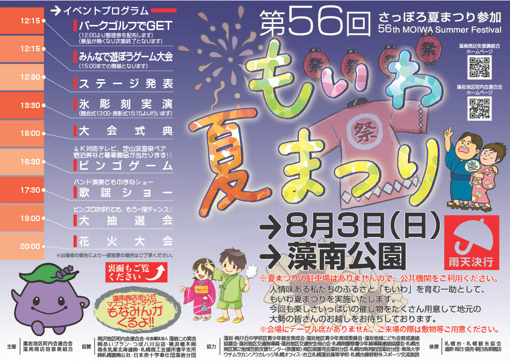 | 8月3日 | 第56回 もいわ夏まつり | 藻南商店街 | 藻南公園 札幌市南区川沿10条1丁目2 |