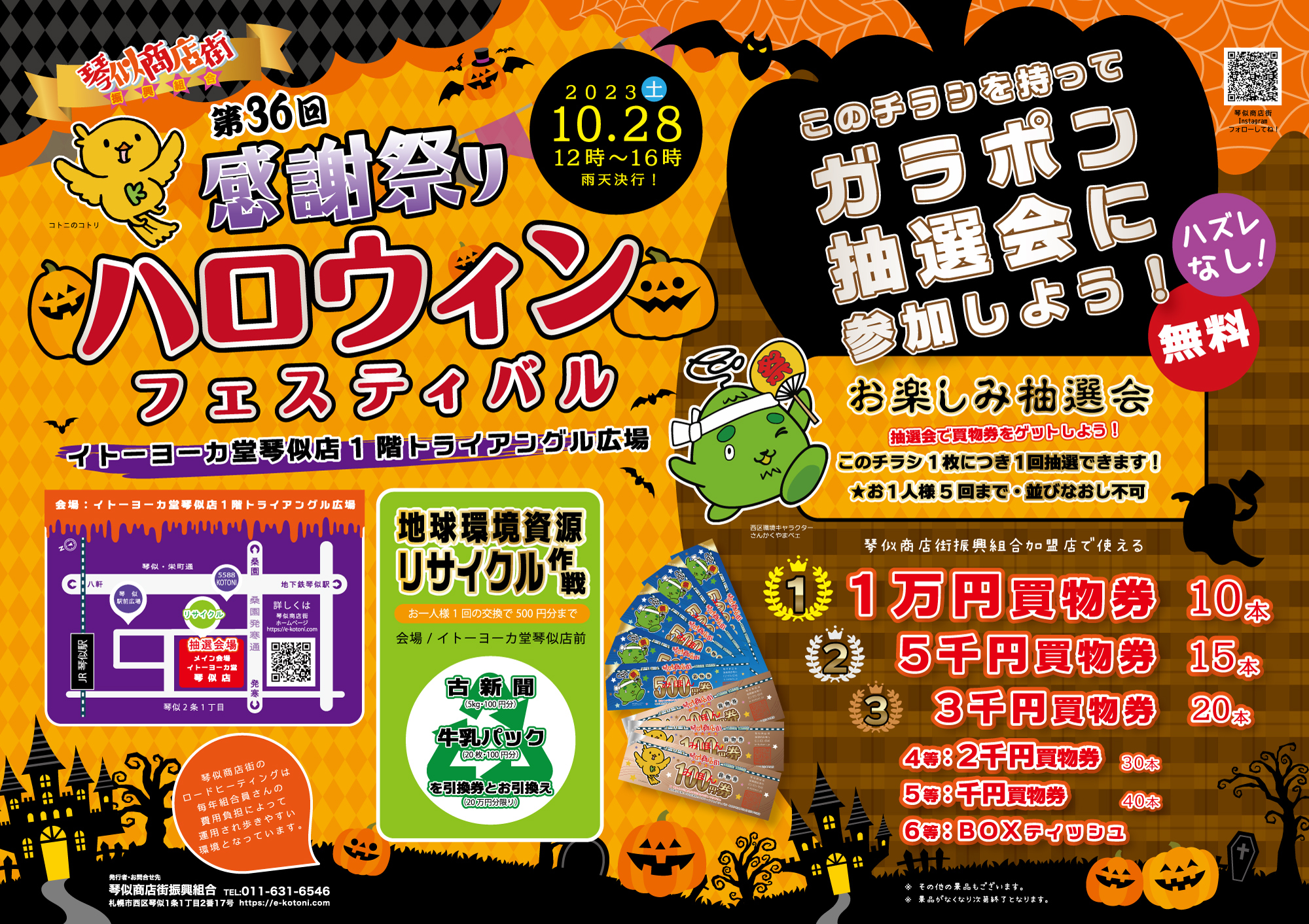 | 10月28日 | 第36回感謝祭りハロウィンフェステバル | 琴似商店街 | イトーヨーカドー堂琴似店1階トライアングル広場 (琴似2条1丁目) |