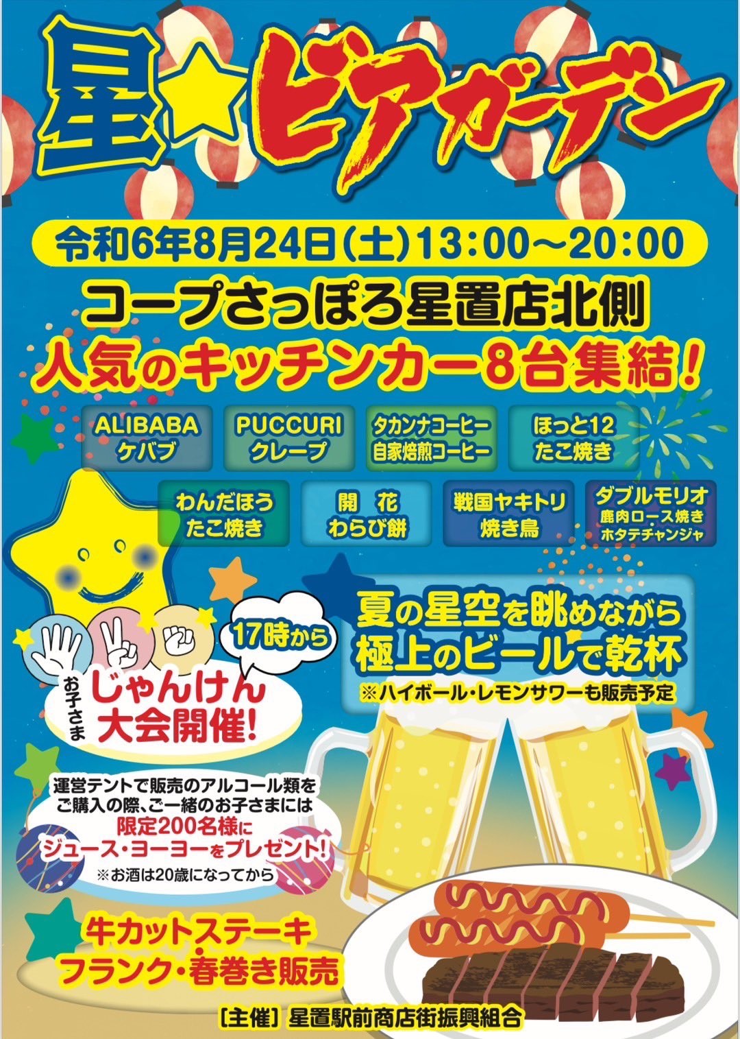 | 8月24日 | 第1回星☆ビアガーデン | 星置駅前商店街 | コープさっぽろ星置店北側 手稲区星置1条3丁目2-2 |
