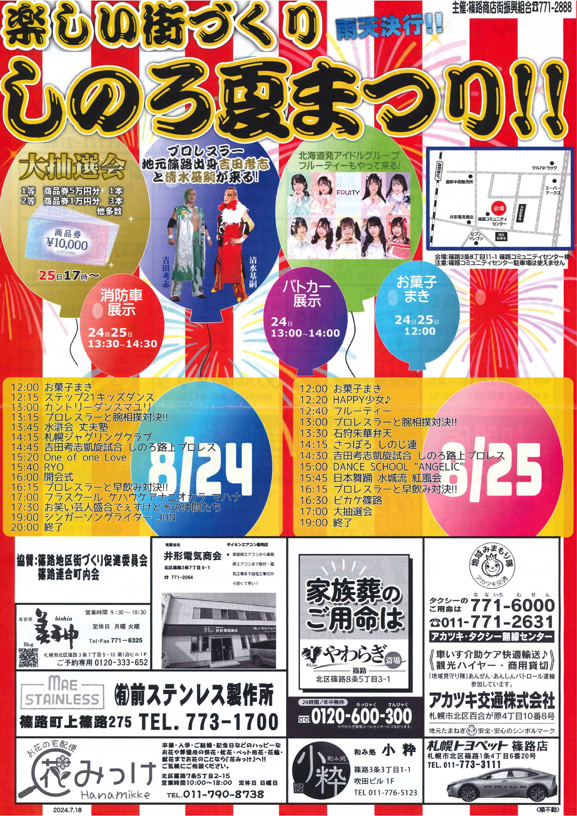 2024楽しい街づくり しのろ夏まつり | 篠路中央商店街 | 篠路コミュニティセンター横 北区篠路3条8丁目11-1 |