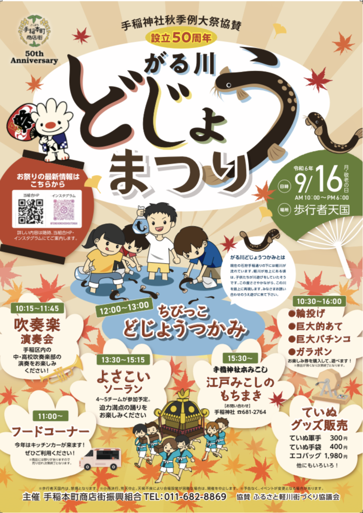 | 9月16日 | がる川どじょうまつり | 手稲本町商店街 | 二十四軒手稲通り 手稲区手稲本町1条3丁目、2条3丁目 |