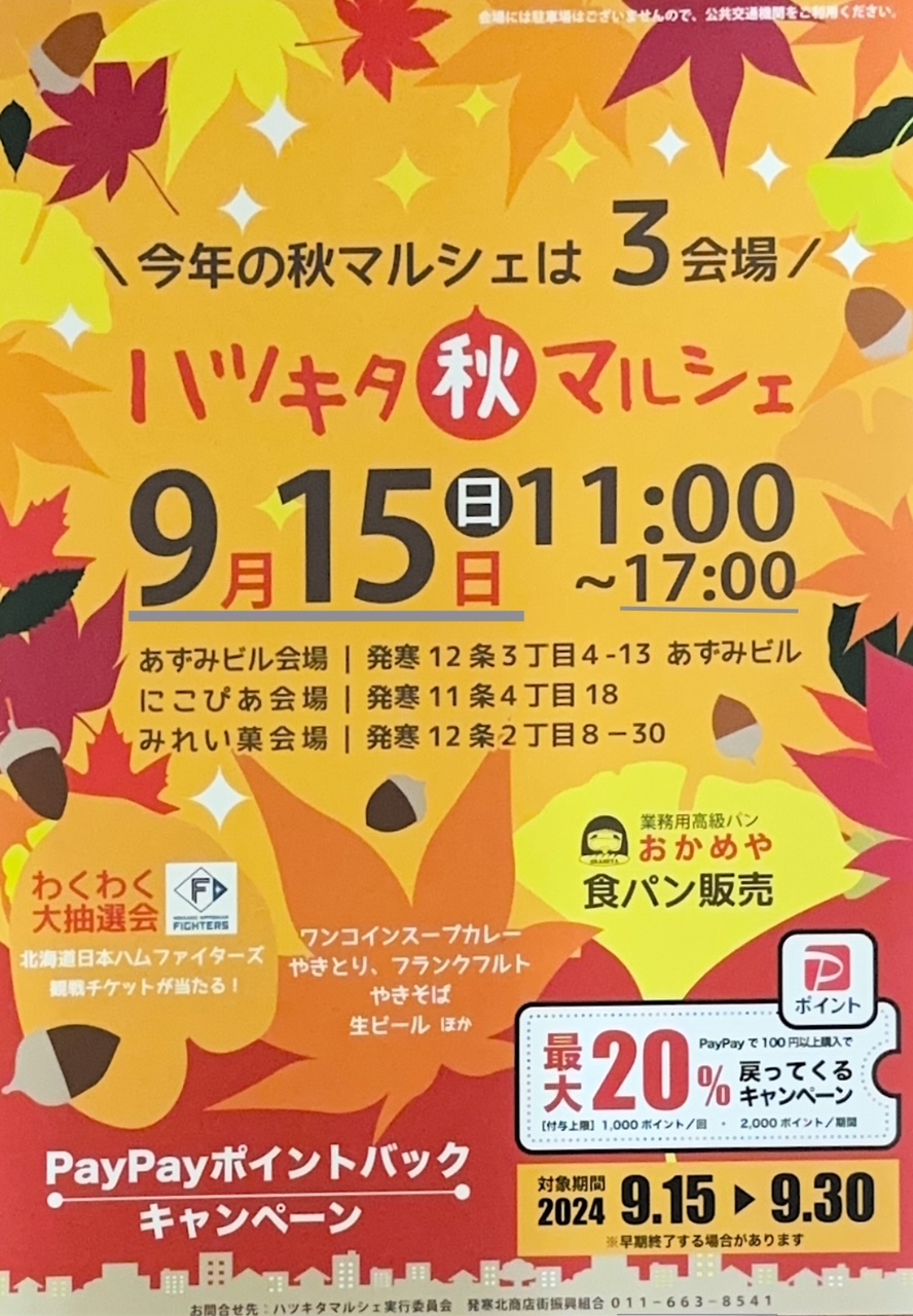 | 9月15日 | ハツキタ秋マルシェ2024 | 発寒北商店街 | Jあずみビル会場:西区発寒12条3丁目4-13 にこぴあ会場:西区発寒11条4丁目18-1 みれい会場:西区発寒12条2丁目8-30 |