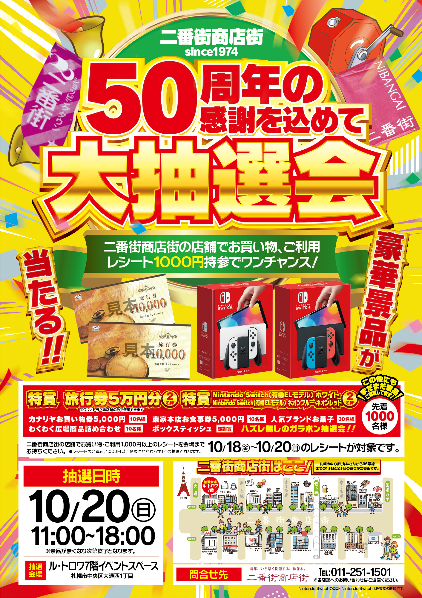| 10月20日 | 二番街商店街50周年の感謝を込めて大抽選会 | 二番街商店街 | ル・トロワ7階イベントスペース 中央区大通西1丁目 |